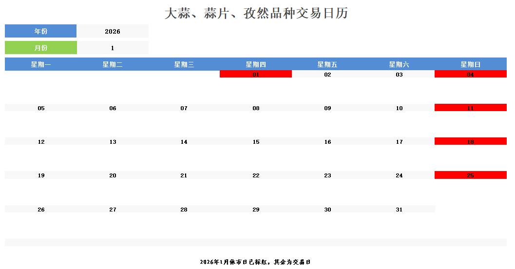大蒜、蒜片、孜然品种:2026年1月1日(星期四)、2026年1月4日(星期日)休市;2026年1月2日(星期五)、2026年1月3日(星期六)正常交易;2026年1月5日(星期一)起照常开市。